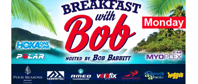 Breakfast with Bob from Kona 2017 Interview Schedule for Monday 8:00 Sebastian Kienle 8:30 Heather Jackson 9:00 Jan Frodeno 9:30 Ben Hoffman 10:00 Leanda Cave 10:30 Lucy Charles 11:00 Alicia Kaye 11:30 Normann Stadler 12:00 Timothy O’Donnell 12:15 Tony Kanaan 12:30 Kathleen McCartney and Mike Levine 1:00 Annabel Luxford *All times HST/Schedule as of October…